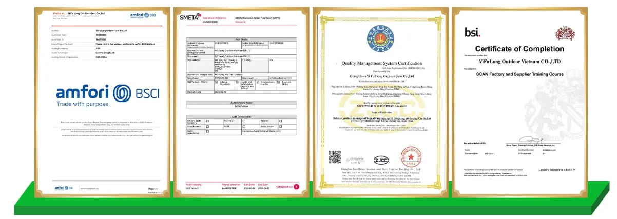 Vi har suksessivt oppnådd en rekke autoritative sertifiseringer, inkludert ISO 9001 for kvalitetsstyring, BSCI/SMETA for sosialt ansvar, og Higg-indeksen for miljømessig bærekraft.